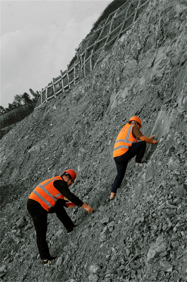 冰冷单调的悬崖峭壁前,只有地质队员背心的一抹红色,象征着地质队员在残酷无情的地质灾害面前所体现的热情、力量、生命力和能量。